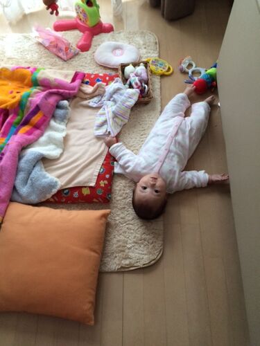 こんにちは。小野幸恵です。 今年も宜しくお願い致します。 今朝の美咲です。 お布団に寝かせていたのですが、ご飯支度しようとちょっと目を離してて、ふと見るとこんなことになってました。 最近は寝返りはお手の物で、ずりずりしながらけっこう移動もする…