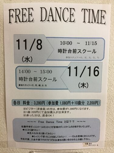いつもお世話になっております! 11月のフリーダンスタイムの告知です。 ・8日水曜日10:00~11:15時計台前スクール ・16日木曜日14:00~15:00時計台前スクール この二回となっております。 だんだんと寒さが厳しくなってきましたが、風邪に負けず元気に踊り…